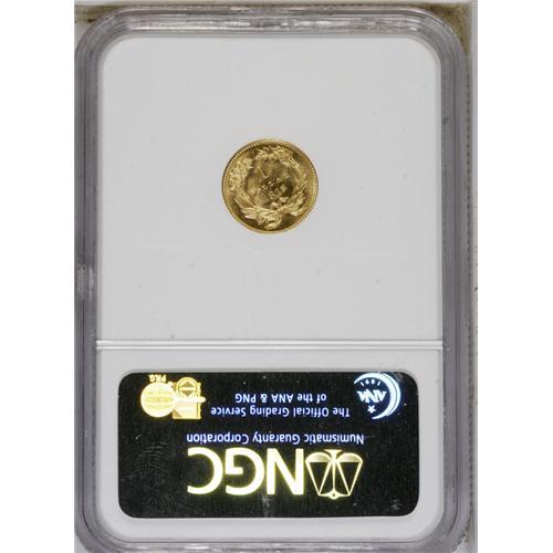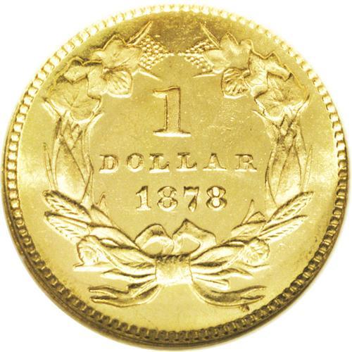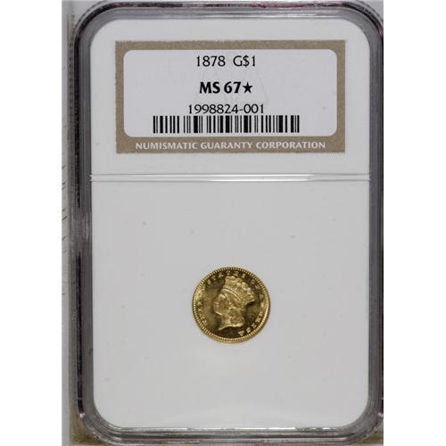 <B>1878 G$1 MS67 <img border='0' src='http://www.heritagecoins.com/images/star.gif' width=10 height=10> NGC.</B></I> The U.S. Mint made a final attempt to circulate the gold dollar in 1873 and 1874. A total of more than 320,000 pieces were struck for those two dates, probably because East coast demand was expected in place of the Federal paper dollar, which then traded near par. After 1874, the gold dollar had only token mintages. For the 1878, just 3,000 pieces were struck. A number were saved, but few compare with present Superb Gem, which has seamless flashy fields and a penetrating strike. The filled final 8 in the date confirms a business origin, per Breen. Struck from rotated dies.<BR><BR><b>Shipping:</b> Coin/Currency (<a target="_blank" href="http://www.heritageauctions.com/common/shipping.php">view shipping information</a>)