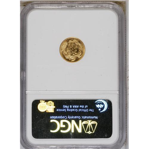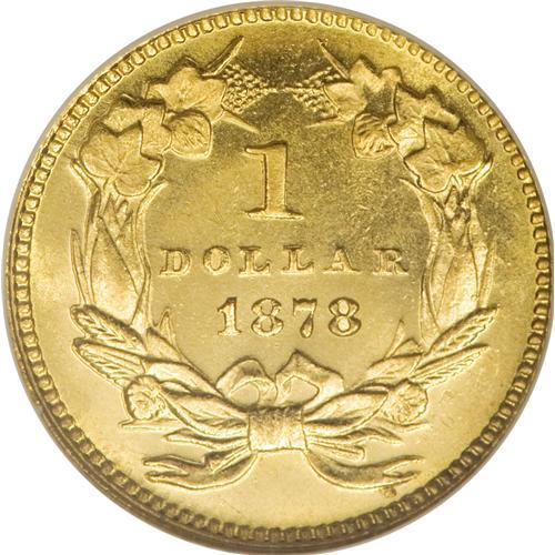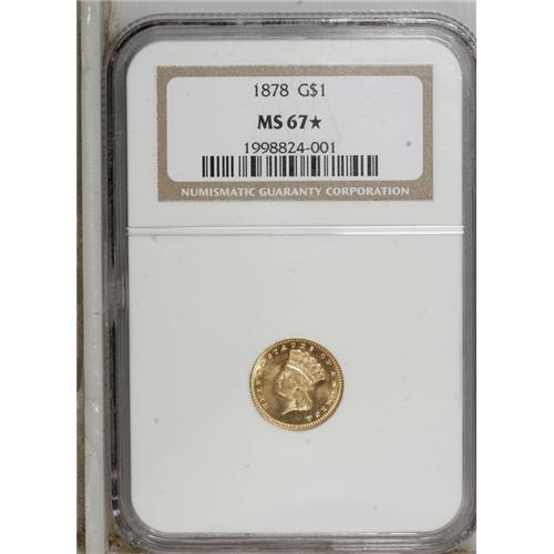 <B>1878 G$1 MS67 <img border='0' src='http://www.heritagecoins.com/images/star.gif' width=10 height=10> NGC.</B></I> The U.S. Mint made a final attempt to circulate the gold dollar in 1873 and 1874. A total of more than 320,000 pieces were struck for those two dates, probably because East coast demand was expected in place of the Federal paper dollar, which then traded near par. After 1874, the gold dollar had only token mintages. For the 1878, just 3,000 pieces were struck. A number were saved, but few compare with present Superb Gem, which has seamless flashy fields and a penetrating strike. The filled final 8 in the date confirms a business origin, per Walter Breen. Struck from rotated dies. Census: 1 in 67 S, 0 finer (4/07).<BR><BR><b>Shipping:</b> Coins & Currency (<a target="_blank" href="http://www.heritageauctions.com/common/shipping.php">view shipping information</a>)
