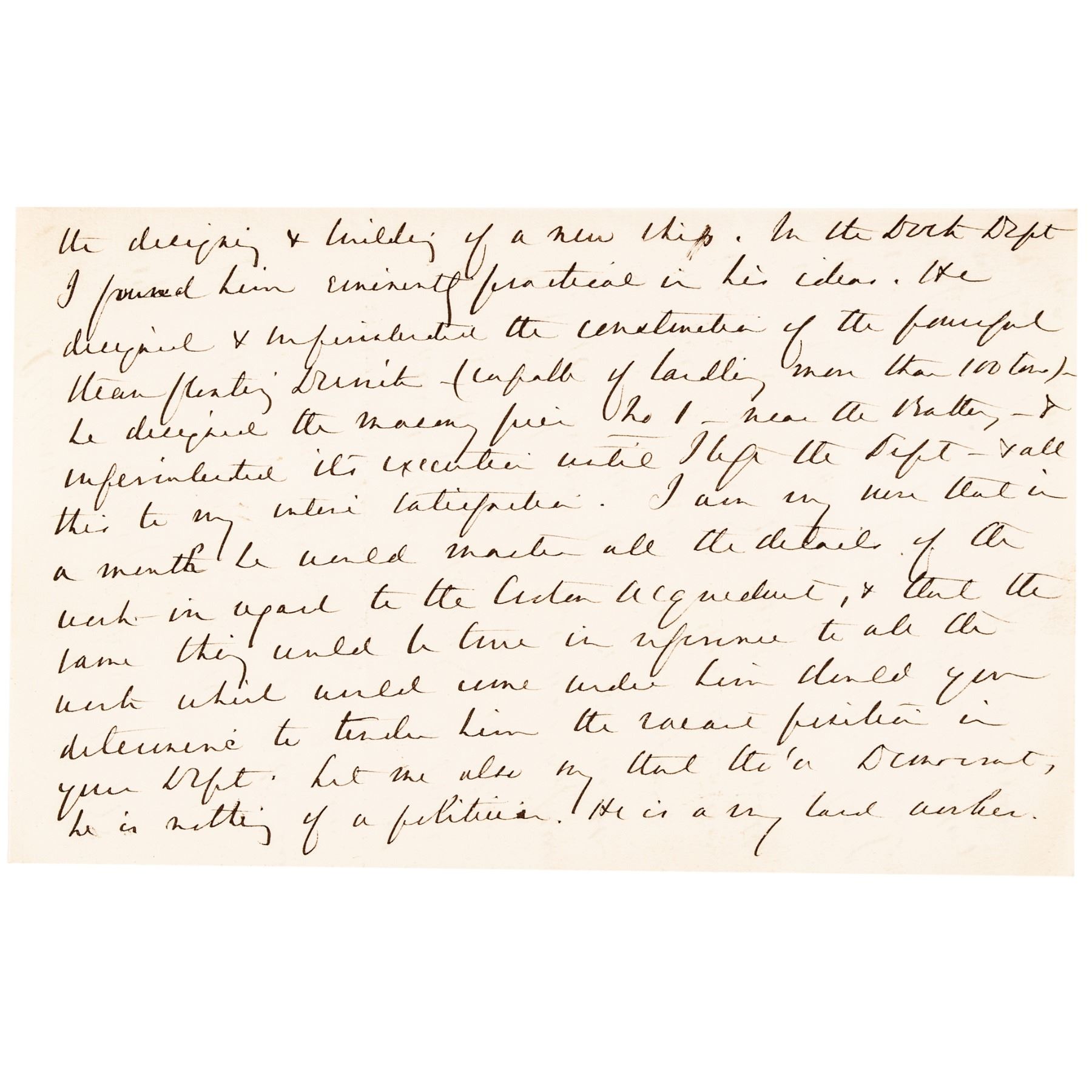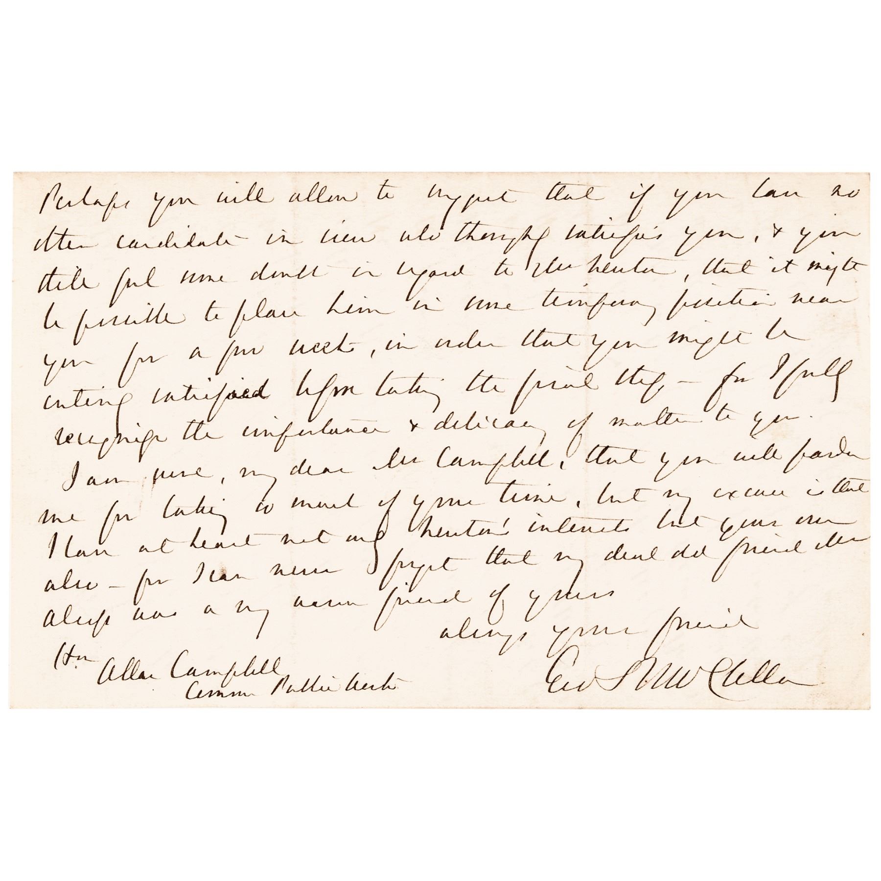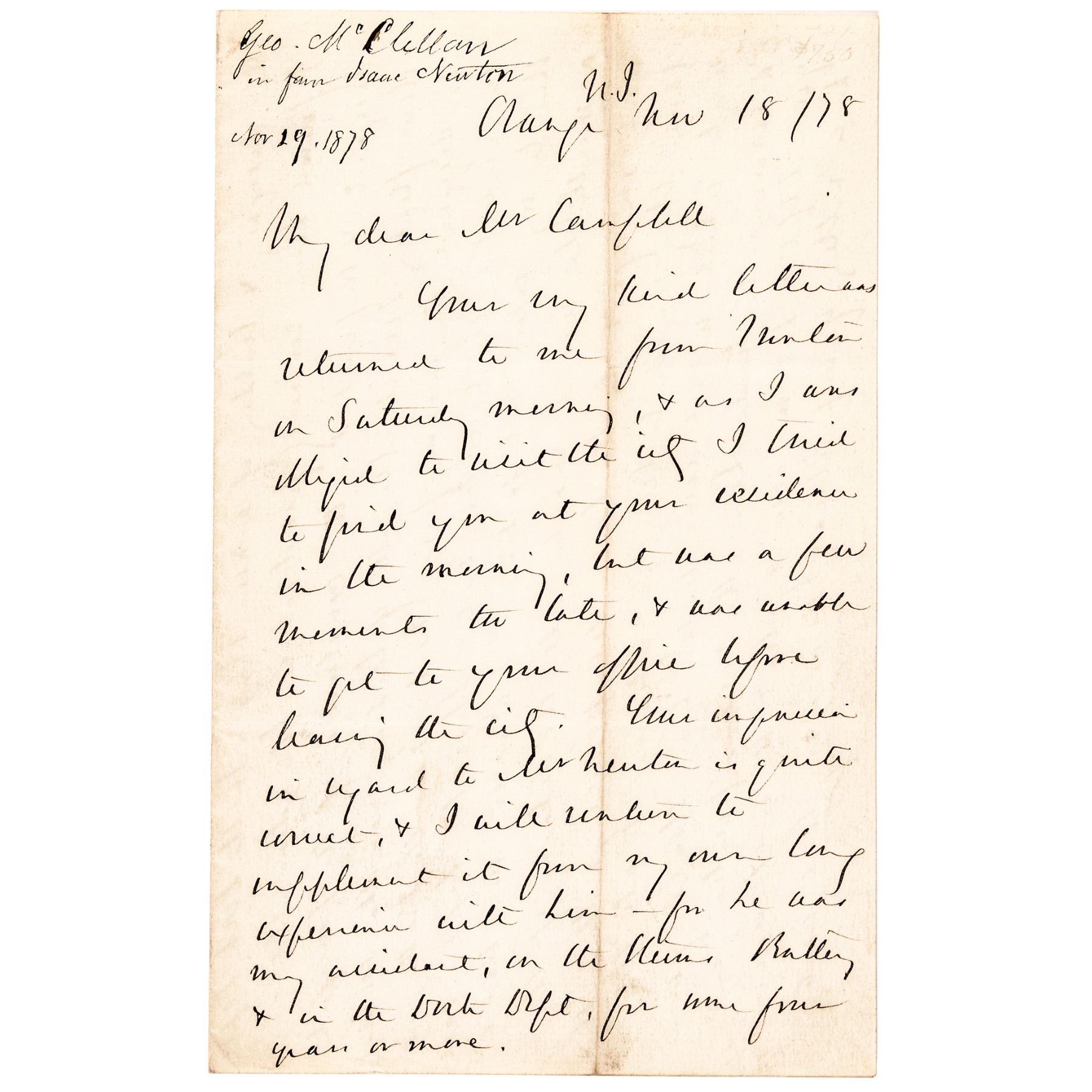 November 29, 1878-Dated, Autograph Letter Signed, “Geo B McClellan”, while the 24th Governor of New Jersey, 4 pages, measuring 5” x 8”, Orange, New Jersey, Choice Very Fine. This Letter is boldly written in rich brown ink on clean wove period paper to Honorable Allan Campbell, Commissioner of Public Works in New York. The content is concerning Isaac Newton, Jr. a noted engineer who served on the USS Monitor (see additional information online), specifically regarding “the designing & building of a new ship.” Also noted at the top left of the first page “Geo. McClellan in favor Isaac Newton.”