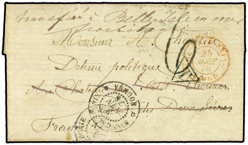 1878 ILE NOU. Carta de un preso político dirigida a otro preso político en BELLE ISLE. En el frente manuscrito "Transféré a Belle en mer". Fechador de NLLE CALEDONIE/NOUMEA y tasa de "6" (decimas). En el interior marca lineal VU LE COMMANDANT DU PENITENTIER. PIEZA MUY INTERESANTE.