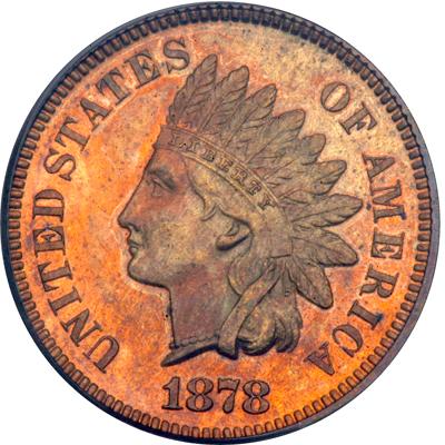 1878 Indian Head Cent. PCGS graded Proof 64 Red Cameo. The color alternates between shades of orange and deeper coppery crimson. Lustrous and well struck with pleasing surfaces. The full, bold transfer from the specially made Proof die to planchet seen in the razor-sharp detail of the feathers and leaves as well as first-class boldness on all letters in LIBERTY on the Indian's headband. Red color is rarely found on an Indian cent of the 1870s. Only 2,350 struck. Pop 4; 7 in PF65; 5 in PF66. (PCGS # 82323).