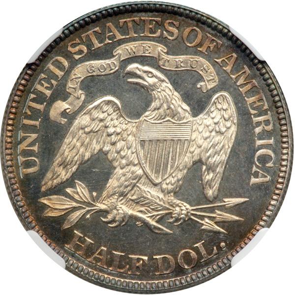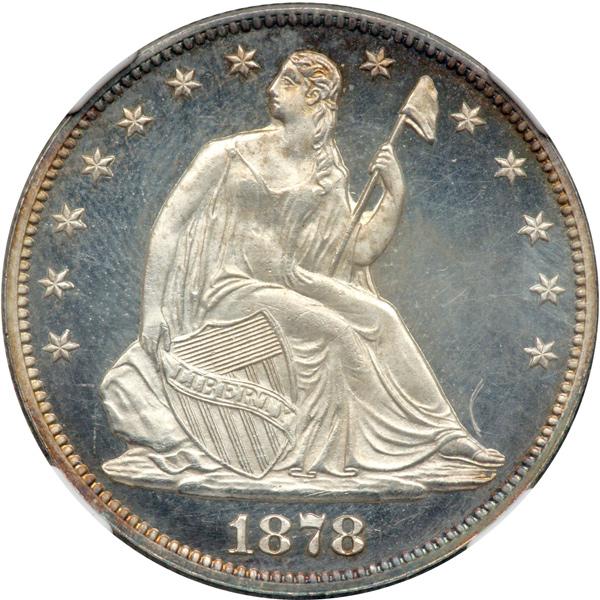 1878 Liberty Seated Half Dollar. NGC graded Proof 66. Only 800 Proofs struck. A gorgeous Gem that has an exacting strike and blushes of light golden brown patina at the edge. The surfaces are virtually pristine. The cameo contrast is very pleasing. The popularity of the seated Liberty half dollar series rises to fever pitch in the higher-grade specimens, thus increasing the demand for Gem Proofs, which are nearly always more rare than the corresponding business strike issue. Pop 12; 2 finer, 1 in 67, 1 in 68.