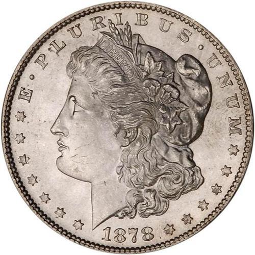 <b>1878 Morgan Dollar. 7 tail feathers, reverse of 1878. ICG graded MS65.</b> Satin fields rippling with cartwheel luster. The more matte designs stand out nicely against this finish. No toning, just silver-white color <b>(PCGS # 7074)</b>