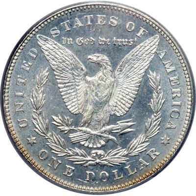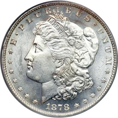 1878 Morgan Dollar. 7 tail feathers, Reverse of 1878. PCGS graded MS-65 PQ. A full satin white coin with semi-reflective fields, lean the coin forward and then back, and from side to side to enjoy the dancing characteristics of the luster. A first-rate specimen in its class. Pop 468; 21 finer in 66 (PCGS # 7074).
