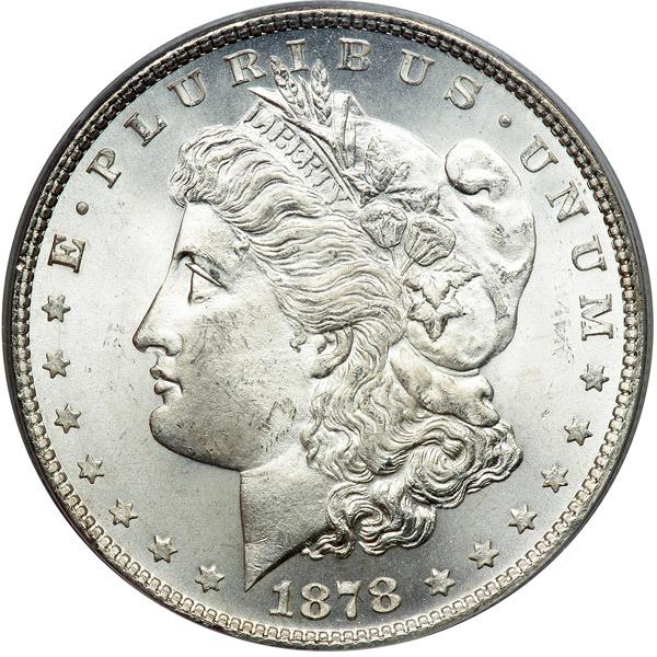 1878 Morgan Dollar. 7 tail feathers, reverse of 1878. PCGS graded MS-65. A well struck frosty white gem. Pop 624; 35 finer (PCGS # 7074) .