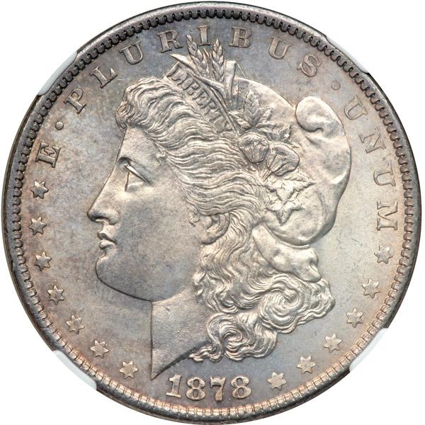 1878 Morgan Dollar. 7 tail feathers, reverse of 1879. NGC graded MS-65. A nice sharp strike with both sides showing signs of delicate golden toning. Pop 132; 13 finer in 66 (PCGS # 7076) .