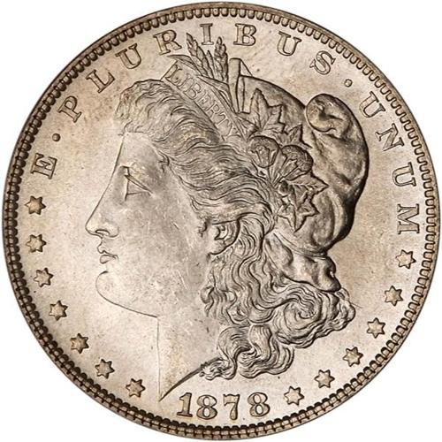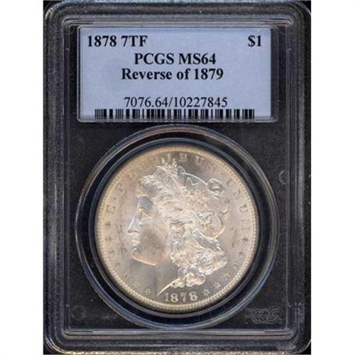 <b>1878 Morgan Dollar. 7 tail feathers, reverse of 1879. PCGS graded MS64.</b> Soft satin-like fields careening with lustrous silver color; a few tiny contact marks on the face <b>(PCGS # 7076)</b>