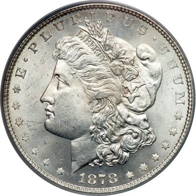 1878 Morgan Dollar. 8 tail feathers. PCGS graded MS-65. A Gem white coin. Only one successful bidder will pass out of the room after the sale with this sharp coin in his possession (The others, who skip bidding, may pass out in their seats once they learn their mistake!) Who will that lucky bidder be? Pop 487; 32 finer, 29 in 66, 2 in 67, 1 in 68 (PCGS # 7072).