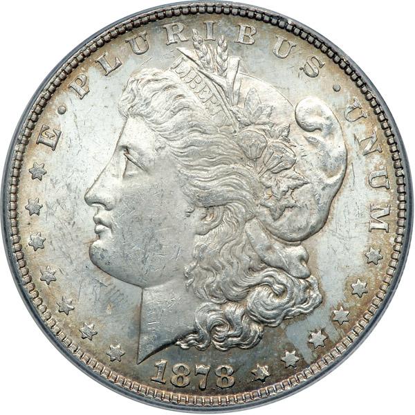 1878 Morgan Dollar. 8 tail feathers. PCGS Genuine. Our grade is MS-60+ toned (PCGS # 7072) .