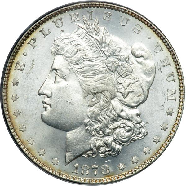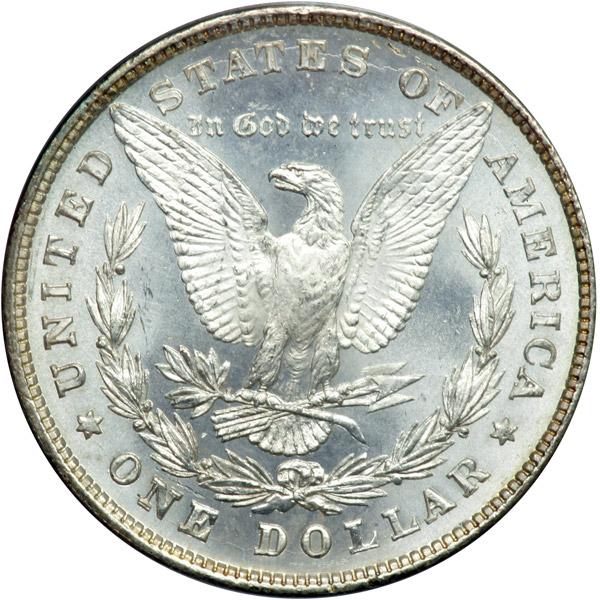 1878 Morgan Dollar. 8 tail feathers. PCGS graded MS-64. Mostly white with a minor chattermark (from the edge of another coin) on Liberty's cheek. Full gem-level luster elsewhere, this being an important first-year issue design. Later in the year and for the duration of the Morgan Dollar design, the mint switched to an eagle with 7 tail feathers (PCGS # 7072) .