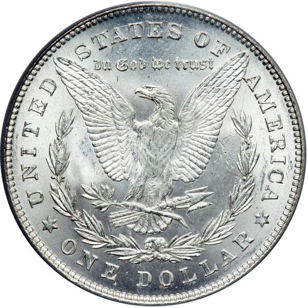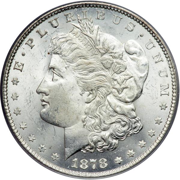 1878 Morgan Dollar. Strongly doubled tail feathers. PCGS graded MS-64. A choice example, frosty and untoned (PCGS # 7078) .