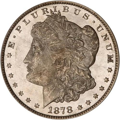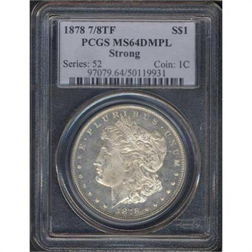 <b>1878 Morgan Dollar. Strongly doubled tail feathers. PCGS graded MS64 DMPL Strong.</b> The former "7 over 8 tail feathers" variety, now demoted to simply doubling on the feathers from two different hubs being used when creating this series of dies (several different dies use the doubled tail feathers, the more desirable being "strongly doubled" the lesser with "weak doubling"). The mirror surfaces ripple with original luster. The coin is untoned and silvery. The only contact mark appear tiny and of little consequence <b>(PCGS # 97079)</b>
