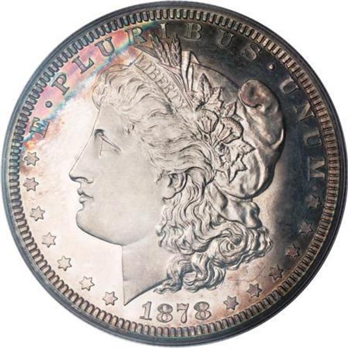 <B>1878 $1 Morgan Dollar, Judd-1550a, Pollock-1725, Low R.6, PR64 Cameo PCGS.</B></I> Similar to the issued Morgan dollar, but the olive branch has only three leaves, the arrowheads are larger, and the eagle's head is more flat and thin. The Pollock subvariety with the wheat ear distant from the R in PLURIBUS. Struck in silver with a reeded edge. Golden-brown, rose-red, and ocean-blue adorns the peripheries of this flashy and impressively undisturbed near-Gem. The devices show occasional minor indifference of strike.<BR><BR><b>Shipping:</b> Coins & Currency (<a target="_blank" href="http://www.heritageauctions.com/common/shipping.php">view shipping information</a>)
