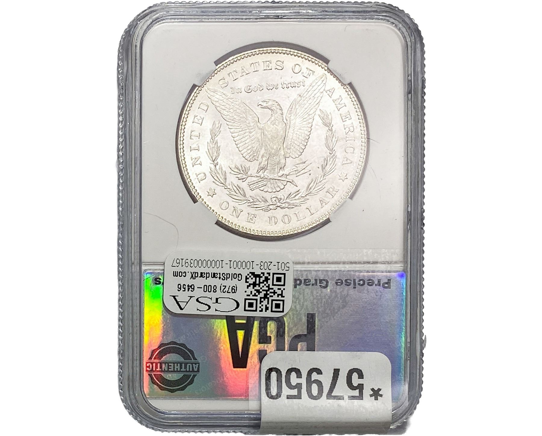 e. Coins sold referencing a third-party grading service are sold “AS IS” without any express or implied warranty, except for a guarantee by GSA that they are genuine. Removal or alteration of the holder, voids all of Bidder’s claims concerning that Product. Certain warranties may be available from the grading services and Bidders are referred to them for further details: Numismatic Guaranty Corporation (NGC), PO Box 4776, Sarasota, FL 34230, www.ngccoin.com/services/writtenguarantee.asp; Professional Coin Grading Services (PCGS), PO Box 9458, Newport Beach, CA 92658, www.pcgs.com/guarantee.html; ANACS, 6555 S. Kenton St., Ste. 303, Englewood, CO 80111; and Independent Coin Grading Co. (ICG), 7901 East Bellview, Ave., Suite 50, Englewood, CO 80111.
