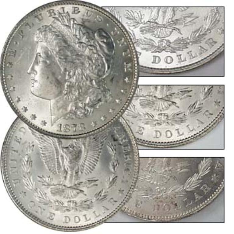 The most famous change in the Morgan silver dollar series came shortly after its initial 1878 release, when an ornithologist contested the eagle's original eight tailfeathers. George T. Morgan then prepared master dies with seventailfeathers. Some remaining "8-Tailfeather" dies were overpunched with the new "7-Tailfeather" hub and the new image did not totally cover the previous one, creating a third "7-over-8" variety. Our trio includes all three of these first-yearvarieties in Original Uncirculated quality. 38.1mm