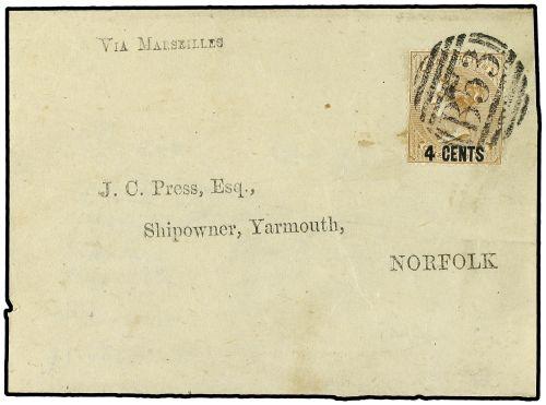 1878 News band wrapper to NORFOLK bearing 4 cents on 1d bistre (SG 84) tied by "B53" obliterator with oval FORWARDED BY RICHARDSON & Co MAURITIUS on reverse and YARMOUTH receiver. Very fine.