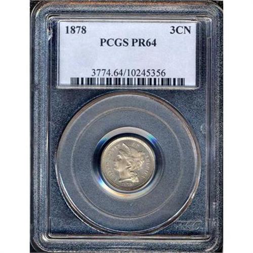 <b>1878 Nickel Three Cents. PCGS graded Proof 64.</b> With the addition of sales individually to collectors this year (not only as full Proof sets), mintage increased markedly to 2,350 pieces. Yet the 1878 has long been a favorite with collectors is only because it, like the 1877, was struck in Proof only. Gleaming, satiny luster and excellent detail. The surfaces are naturally, but lightly toned <b>(PCGS # 3774)</b> <i>