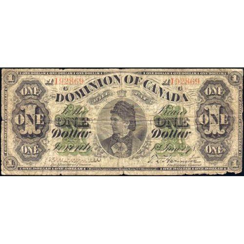1878 One Dollar Lettered Border, Payable at Toronto, Series A, DC-8f-i, Serial Number A192869 B, Good. A few gaps along the margins and some pinholes