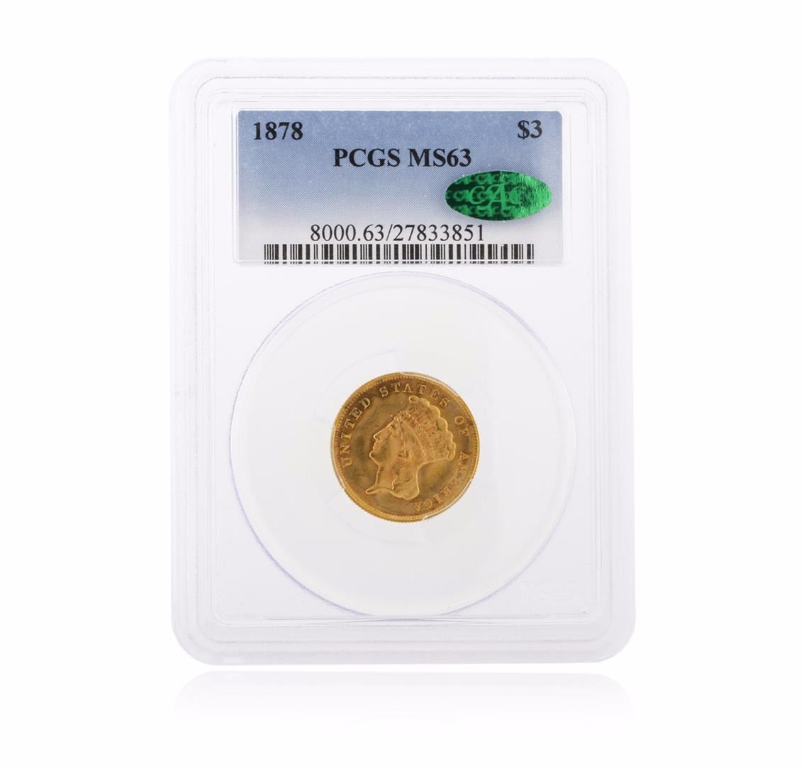 One 1878 PCGS MS63 $3 Indian Princess Head Gold Coin. PCGS Certified.