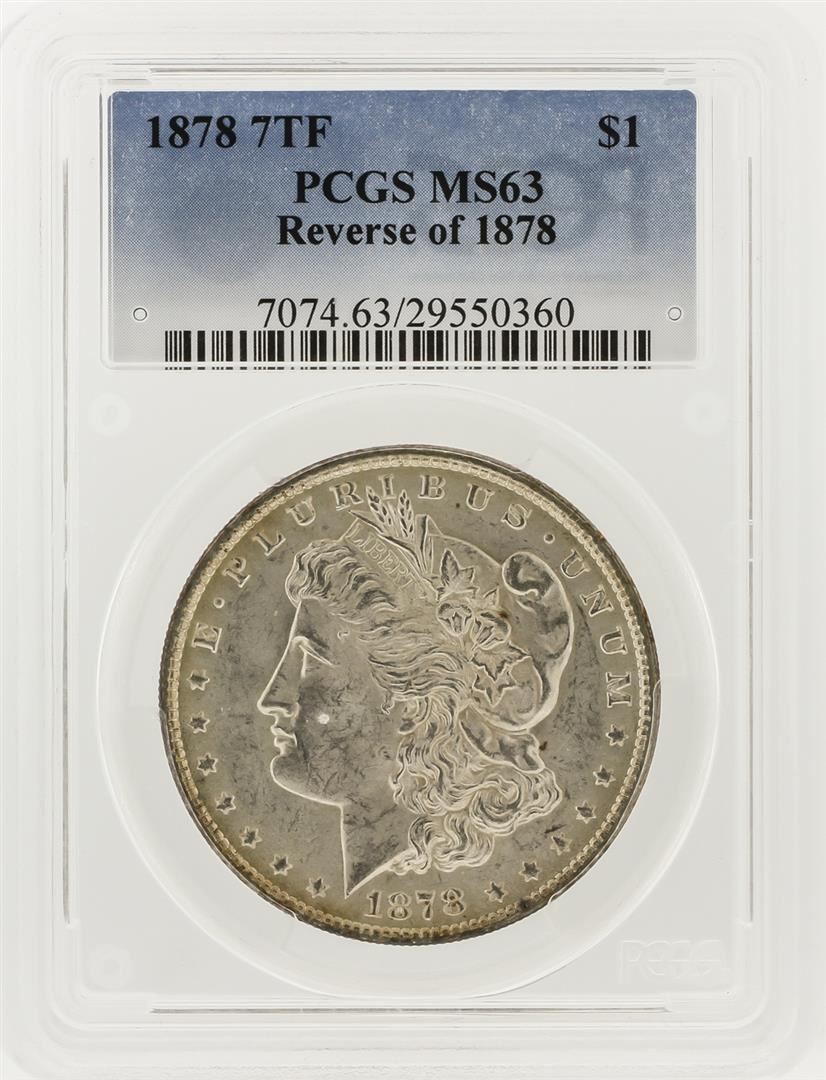 One 1878 (7 feathers; parallel top arrow feather; concave breast) PCGS MS63 Morgan Silver Dollar. PCGS Certified.