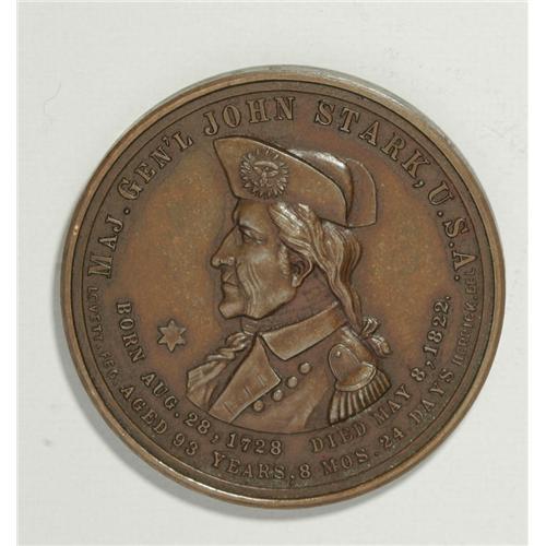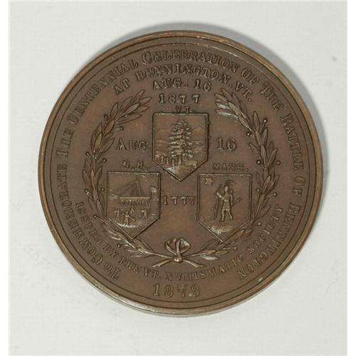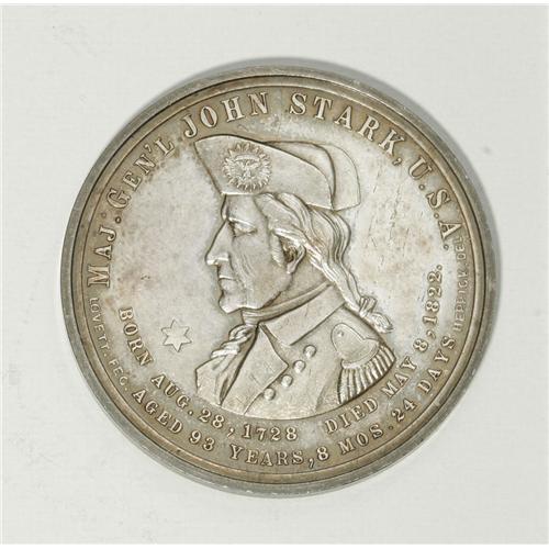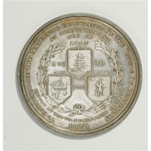 <B>1878 Pair of Commemorative Medals, Major General John Stark.</B></I> Two medallions, a silver version and a brown copper one, issued to commemorate the Battle of Bennington, Vermont, in 1777. These medals measure approximately 40 mm each and were issued by the Vermont Numismatic Society. The obverse of each medal depicts Major General John Stark. The medals were die-sunk by Robert Lovett and engraved by Hennrick of Delaware. A nice pair from an early numismatic organization. The market value is about $125-$175.<BR><BR><b>Shipping:</b> Coins & Currency (<a target="_blank" href="http://www.heritageauctions.com/common/shipping.php">view shipping information</a>)
