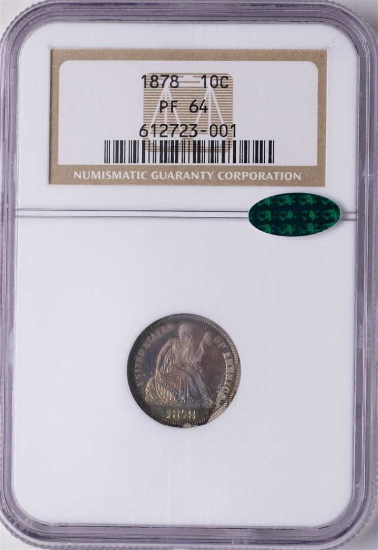 One 1878 Proof Seated Liberty Dime Coin NGC PF64 CAC Amazing Toning. NGC Certified.