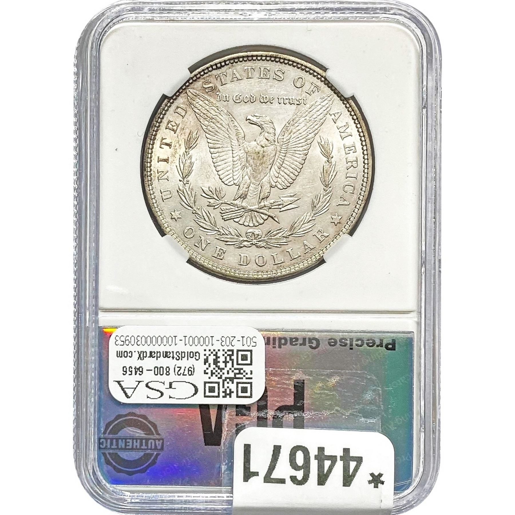 e. Coins sold referencing a third-party grading service are sold “AS IS” without any express or implied warranty, except for a guarantee by GSA that they are genuine. Removal or alteration of the holder, voids all of Bidder’s claims concerning that Product. Certain warranties may be available from the grading services and Bidders are referred to them for further details: Numismatic Guaranty Corporation (NGC), PO Box 4776, Sarasota, FL 34230, www.ngccoin.com/services/writtenguarantee.asp; Professional Coin Grading Services (PCGS), PO Box 9458, Newport Beach, CA 92658, www.pcgs.com/guarantee.html; ANACS, 6555 S. Kenton St., Ste. 303, Englewood, CO 80111; and Independent Coin Grading Co. (ICG), 7901 East Bellview, Ave., Suite 50, Englewood, CO 80111.