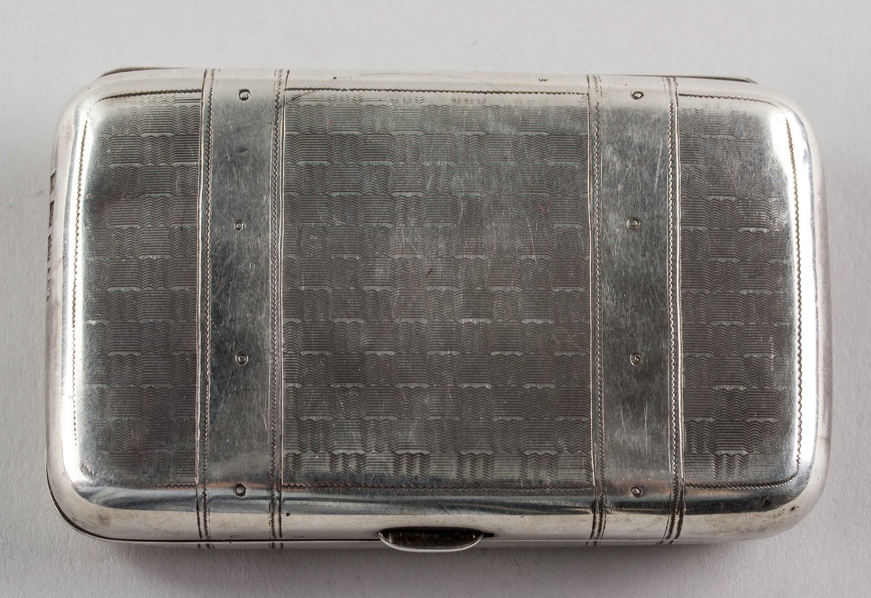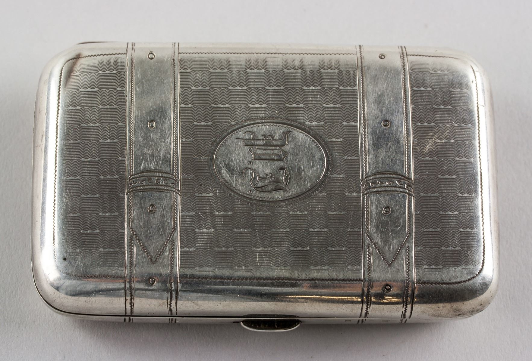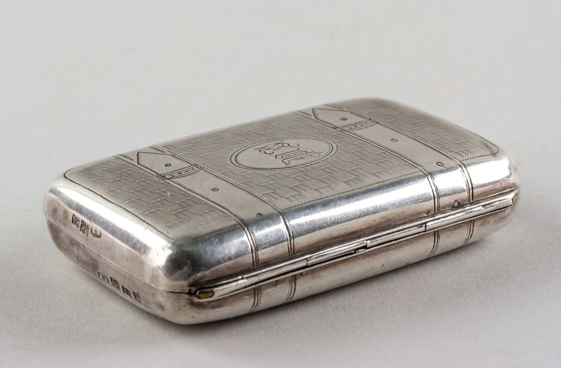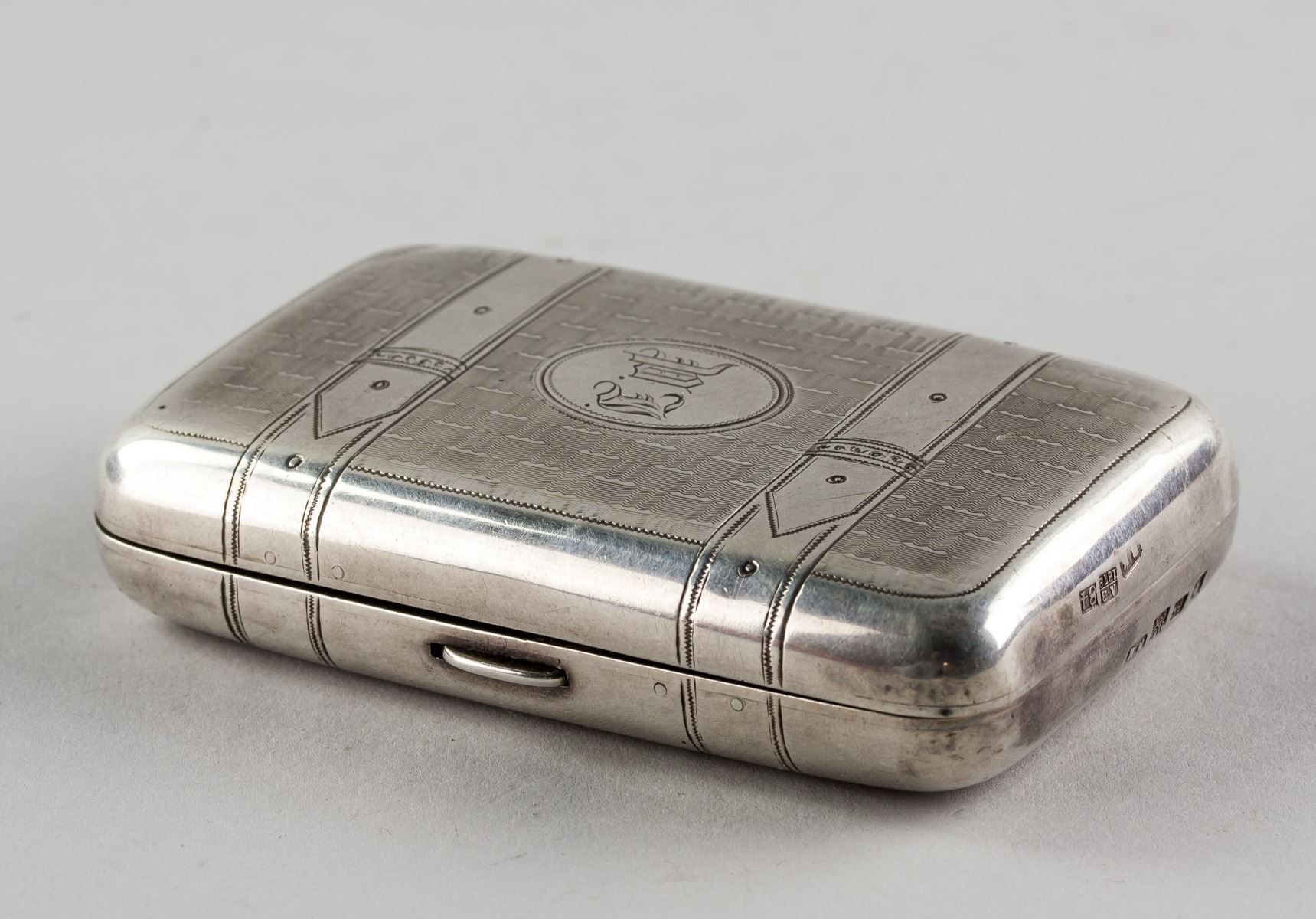 1878 Russian fine silver cigarette case, of rectangle form with rounded corners, carved with belt pattern on top, with 7 assorted marks, 9.5 x 6 cm, 105 grams