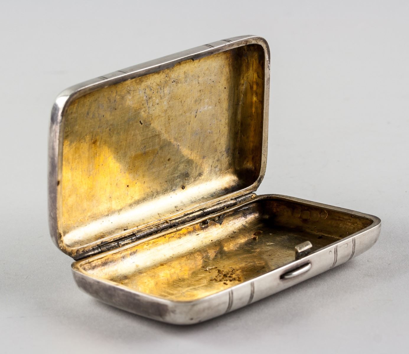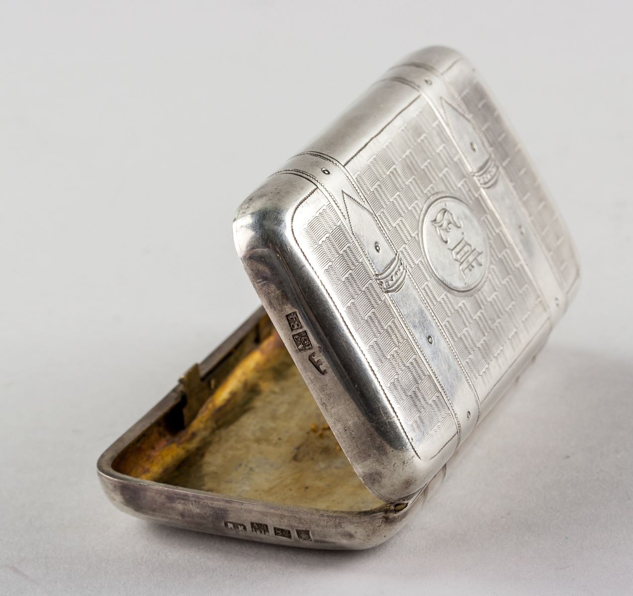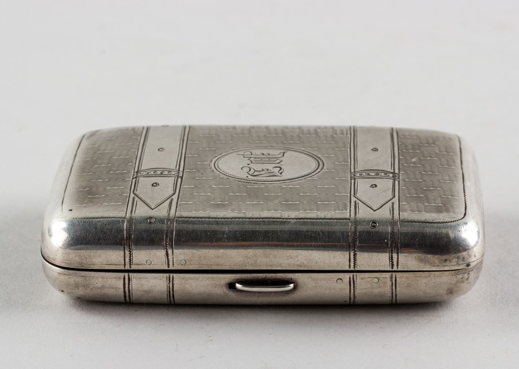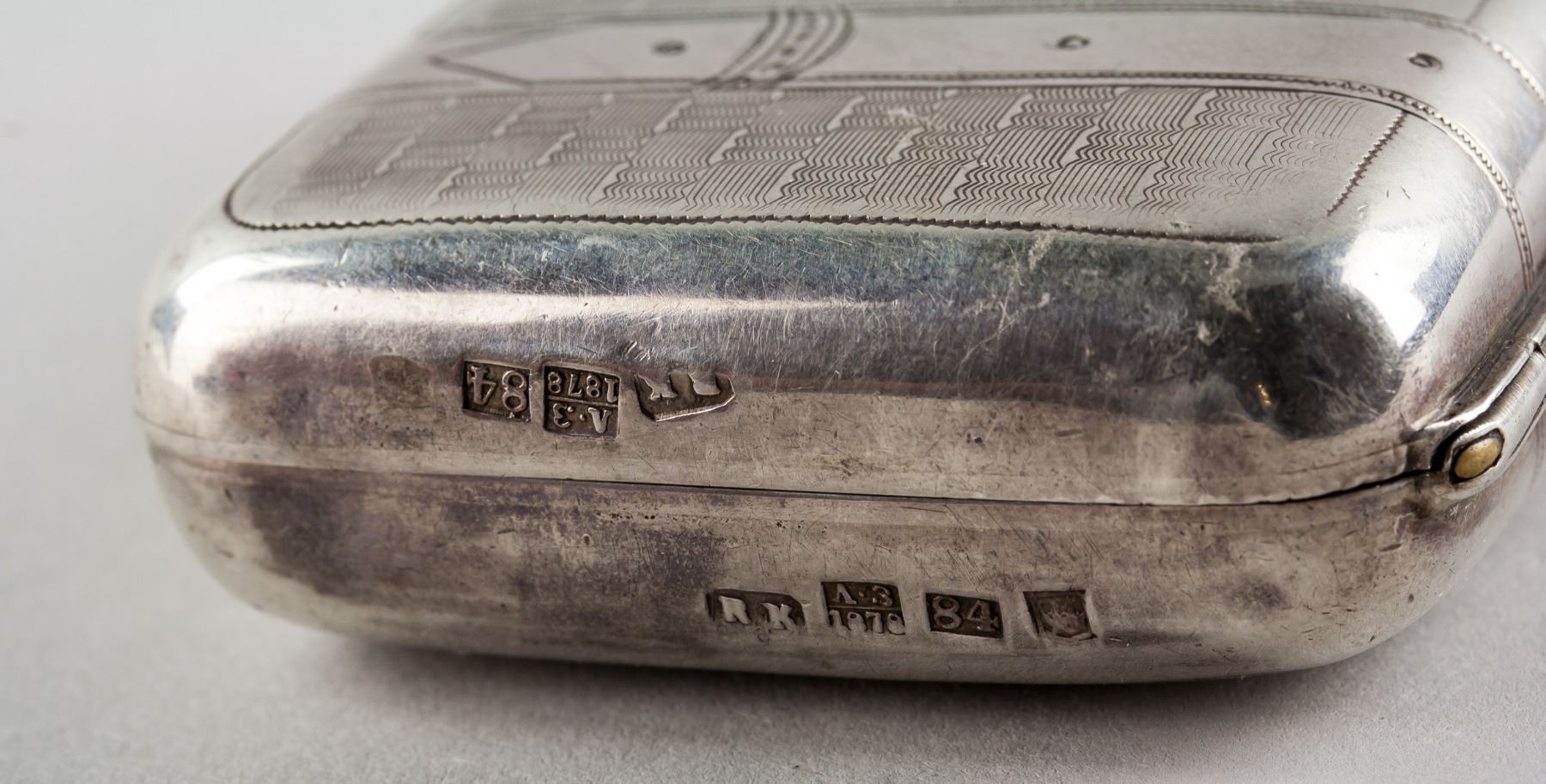 1878 Russian fine silver cigarette case, of rectangle form with rounded corners, carved with belt pattern on top, with 7 assorted marks, 9.5 x 6 cm, 105 grams
