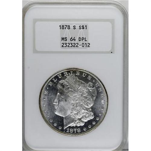 <B>1878-S $1 MS64 Deep Mirror Prooflike NGC.</B></I> NGC Census: (122/26). PCGS Population (48/18). Mintage: 9,774,000. Numismedia Wsl. Price for NGC/PCGS coin in MS64: $675. (#97083)<BR><BR><b>Shipping:</b> Coins & Currency (<a target="_blank" href="http://www.heritageauctions.com/common/shipping.php">view shipping information</a>)