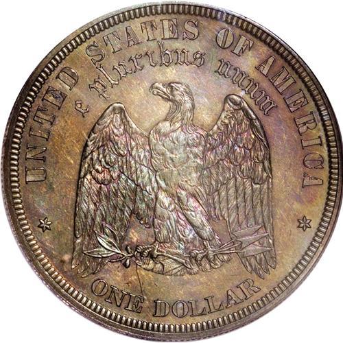 <B>1878 S$1 Dollar, Judd-1554, Pollock-1737, R.5, PR63 PCGS.</B></I> The head of Liberty is large and faces left with IN GOD WE TRUST at the top and the date below. Similar to the pattern fifty dollar gold pieces from 1877. The reverse has a spread winged eagle with E PLURIBUS UNUM in Gothic lettering above. UNITED STATES OF AMERICA is at the top and ONE DOLLAR on the bottom rim. Struck in silver with a reeded edge. Both sides exhibit mottled olive-copper toning that yields to brighter orange-apricot, lilac, and electric-blue undertones at direct angles. The bold strike is free of criticism.<BR><BR><b>Shipping:</b> Coin/Currency (<a target="_blank" href="http://www.heritageauctions.com/common/shipping.php">view shipping information</a>)