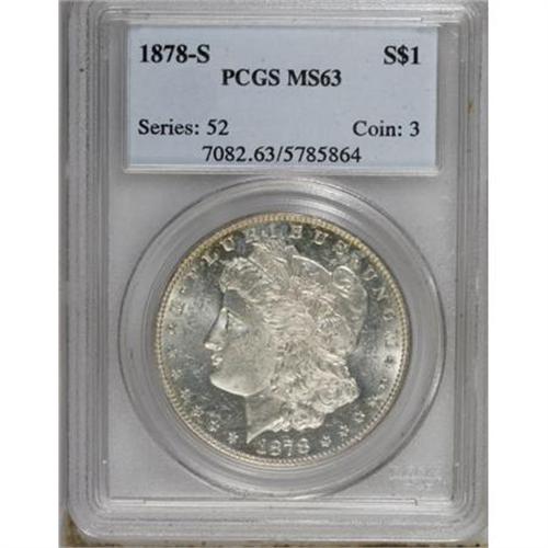 <B>1878-S $1 MS63 PCGS.</B></I> PCGS Population (8008/12728). NGC Census: (5945/13808). Mintage: 9,774,000. Numismedia Wsl. Price for NGC/PCGS coin in MS63: $53. (#7082)<BR><BR><B>Coin Engraver:</B> George T. Morgan<BR><BR><b>Shipping:</b> Coins & Currency (<a target="_blank" href="http://www.heritageauctions.com/common/shipping.php">view shipping information</a>)