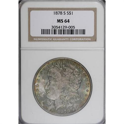 <B>1878-S $1 MS64 NGC.</B></I> NGC Census: (10159/3649). PCGS Population (9277/3474). Mintage: 9,774,000. Numismedia Wsl. Price for NGC/PCGS coin in MS64: $85. (#7082)<BR><BR><B>Coin Engraver:</B> George T. Morgan<BR><BR><b>Shipping:</b> Coins & Currency (<a target="_blank" href="http://www.heritageauctions.com/common/shipping.php">view shipping information</a>)
