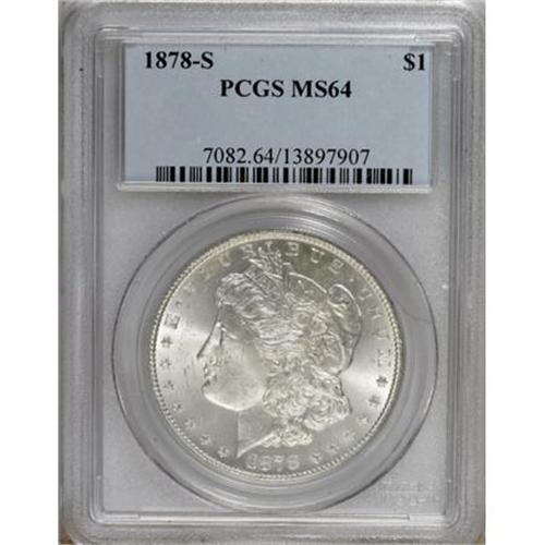 <B>1878-S $1 MS64 PCGS.</B></I> PCGS Population (9093/3418). NGC Census: (10028/3628). Mintage: 9,774,000. Numismedia Wsl. Price for NGC/PCGS coin in MS64: $84. (#7082)<BR><BR><B>Coin Engraver:</B> George T. Morgan<BR><BR><b>Shipping:</b> Coins & Currency (<a target="_blank" href="http://www.heritageauctions.com/common/shipping.php">view shipping information</a>\)