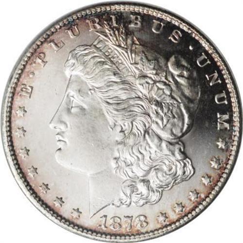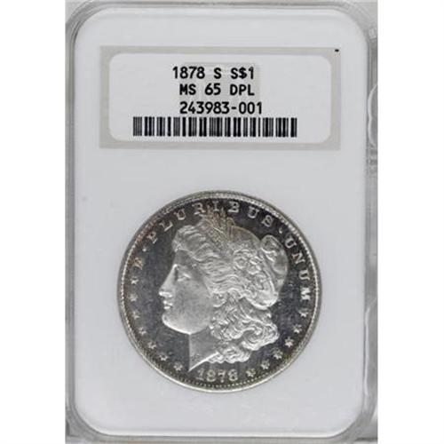 <B>1878-S $1 MS65 Deep Mirror Prooflike NGC.</B></I> This precisely struck Gem has flashy mirrored fields and noticeable frost throughout the devices. The sweet spot of the cheek is especially smooth. The borders exhibit plum-red and apricot toning. In a prior generation holder. Census: 25 in 65 Deep Mirror Prooflike, 1 finer (11/07).<BR><BR><b>Shipping:</b> Coins & Currency (<a target="_blank" href="http://www.heritageauctions.com/common/shipping.php">view shipping information</a>)