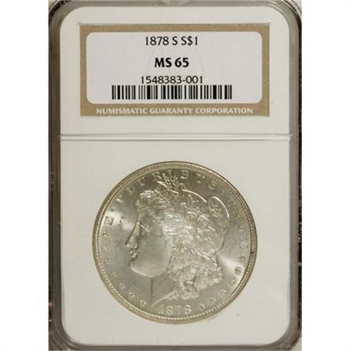 <B>1878-S $1 MS65 NGC.</B></I> NGC Census: (3205/432). PCGS Population (2943/483). Mintage: 9,774,000. Numismedia Wsl. Price for NGC/PCGS coin in MS65: $232. (#7082)<BR><BR><B>Coin Engraver:</B> George T. Morgan<BR><BR><b>Shipping:</b> Coins & Currency (<a target="_blank" href="http://www.heritageauctions.com/common/shipping.php">view shipping information</a>\)