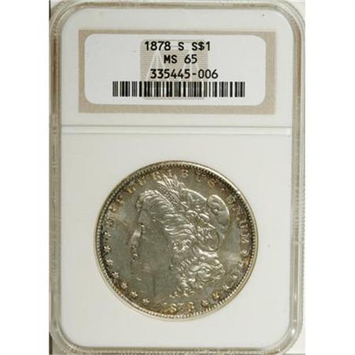 <B>1878-S $1 MS65 NGC.</B></I> NGC Census: (3213/436). PCGS Population (2977/493). Mintage: 9,774,000. Numismedia Wsl. Price for NGC/PCGS coin in MS65: $225. (#7082)<BR><BR><B>Coin Engraver:</B> George T. Morgan<BR><BR><b>Shipping:</b> Coins & Currency (<a target="_blank" href="http://www.heritageauctions.com/common/shipping.php">view shipping information</a>)