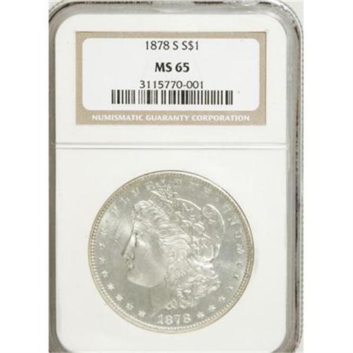 <B>1878-S $1 MS65 NGC.</B></I> NGC Census: (3213/436). PCGS Population (2975/490). Mintage: 9,774,000. Numismedia Wsl. Price for NGC/PCGS coin in MS65: $225. (#7082)<BR><BR><B>Coin Engraver:</B> George T. Morgan<BR><BR><b>Shipping:</b> Coins & Currency (<a target="_blank" href="http://www.heritageauctions.com/common/shipping.php">view shipping information</a>)