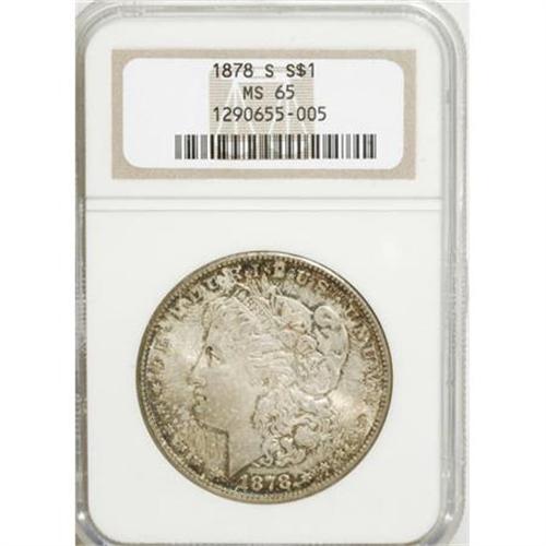 <B>1878-S $1 MS65 NGC.</B></I> NGC Census: (3242/445). PCGS Population (2988/488). Mintage: 9,774,000. Numismedia Wsl. Price for NGC/PCGS coin in MS65: $225. (#7082)<BR><BR><B>Coin Engraver:</B> George T. Morgan<BR><BR><b>Shipping:</b> Coins & Currency (<a target="_blank" href="http://www.heritageauctions.com/common/shipping.php">view shipping information</a>)