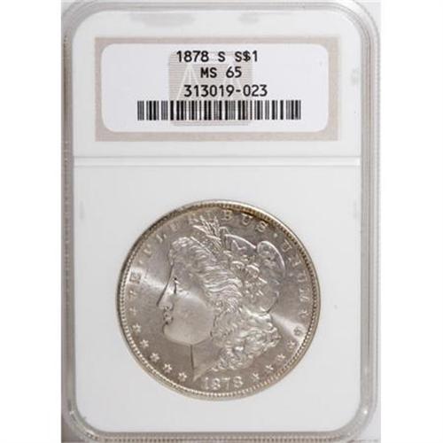 <B>1878-S $1 MS65 NGC.</B></I> NGC Census: (3247/445). PCGS Population (2989/488). Mintage: 9,774,000. Numismedia Wsl. Price for NGC/PCGS coin in MS65: $225. (#7082)<BR><BR><B>Coin Engraver:</B> George T. Morgan<BR><BR><b>Shipping:</b> Coins & Currency (<a target="_blank" href="http://www.heritageauctions.com/common/shipping.php">view shipping information</a>)
