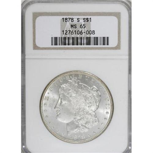 <B>1878-S $1 MS65 NGC.</B></I> NGC Census: (3249/446). PCGS Population (2990/489). Mintage: 9,774,000. Numismedia Wsl. Price for NGC/PCGS coin in MS65: $220. (#7082)<BR><BR><B>Coin Engraver:</B> George T. Morgan<BR><BR><b>Shipping:</b> Coins & Currency (<a target="_blank" href="http://www.heritageauctions.com/common/shipping.php">view shipping information</a>)