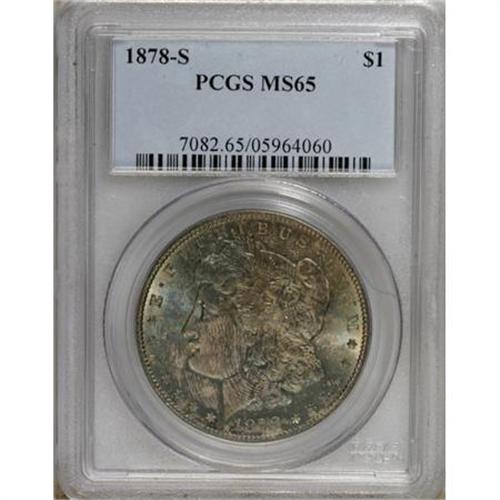 <B>1878-S $1 MS65 PCGS.</B></I> PCGS Population (2943/483). NGC Census: (3205/432). Mintage: 9,774,000. Numismedia Wsl. Price for NGC/PCGS coin in MS65: $232. (#7082)<BR><BR><B>Coin Engraver:</B> George T. Morgan<BR><BR><b>Shipping:</b> Coins & Currency (<a target="_blank" href="http://www.heritageauctions.com/common/shipping.php">view shipping information</a>\)