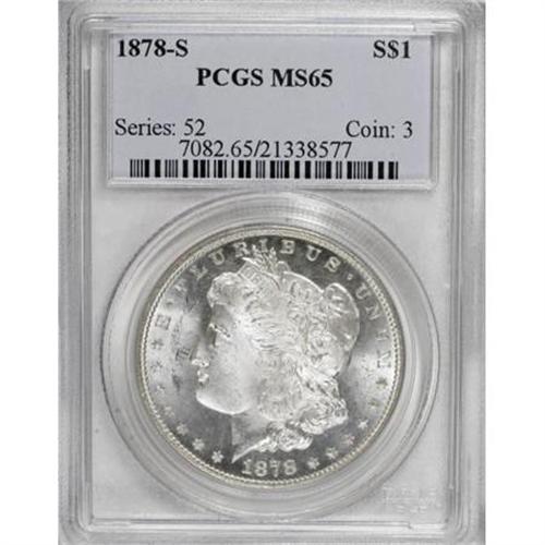 <B>1878-S $1 MS65 PCGS.</B></I> PCGS Population (2954/487). NGC Census: (3213/436). Mintage: 9,774,000. Numismedia Wsl. Price for NGC/PCGS coin in MS65: $225. (#7082)<BR><BR><B>Coin Engraver:</B> George T. Morgan<BR><BR><b>Shipping:</b> Coins & Currency (<a target="_blank" href="http://www.heritageauctions.com/common/shipping.php">view shipping information</a>)