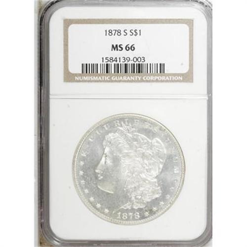 <B>1878-S $1 MS66 NGC.</B></I> This is an exquisitely struck Premium Gem, evidenced by sharp delineation in the hair over the ear and on the breast feathers. Essentially untoned surfaces exhibit a couple of grade-consistent marks.<BR><BR><B>Coin Engraver:</B> George T. Morgan<BR><BR><b>Shipping:</b> Coins & Currency (<a target="_blank" href="http://www.heritageauctions.com/common/shipping.php">view shipping information</a>)