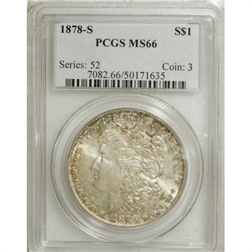<B>1878-S $1 MS66 PCGS.</B></I> Speckled green and russet patina decorates the obverse and reverse peripheries. Lustrous and well struck without distractions on either side. From the Short Nock reverse hub.<BR><BR><b>Shipping:</b> Coins & Currency (<a target="_blank" href="http://www.heritageauctions.com/common/shipping.php">view shipping information</a>)