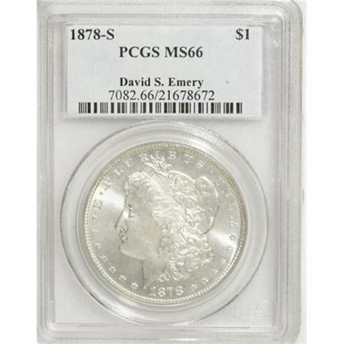 <B>1878-S $1 MS66 PCGS.</B></I> Ex: David S. Emery Collection. Booming cartwheel luster emanates from the surfaces of this essentially untoned Premium Gem. Faint die striations are noted in the fields. Surface marks are minimal on each side of this impressive example, from the first year of the Morgan dollar series. <BR><BR><B>Coin Engraver:</B> George T. Morgan<BR><BR><b>Shipping:</b> Coins & Currency (<a target="_blank" href="http://www.heritageauctions.com/common/shipping.php">view shipping information</a>)