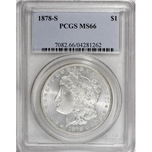 <B>1878-S $1 MS66 PCGS.</B></I> PCGS Population (473/20). NGC Census: (407/29). Mintage: 9,774,000. Numismedia Wsl. Price for NGC/PCGS coin in MS66: $720. (#7082)<BR><BR><B>Coin Engraver:</B> George T. Morgan<BR><BR><b>Shipping:</b> Coins & Currency (<a target="_blank" href="http://www.heritageauctions.com/common/shipping.php">view shipping information</a>)