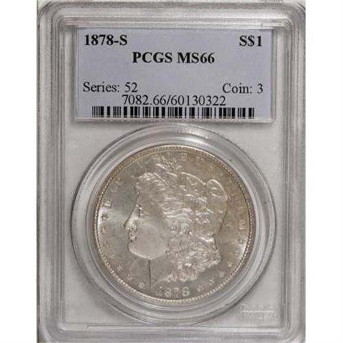 <B>1878-S $1 MS66 PCGS.</B></I> A crisply struck and modestly reflective example from this first-year San Francisco issue, gleaming beneath tan-accented silver-gray patina. PCGS has certified 20 finer examples (1/08).<BR><I>From The Jimmy G. PCGS Registry Collection of Morgan Dollars with Varieties.</B></I><BR><BR><B>Coin Engraver:</B> George T. Morgan<BR><BR><b>Shipping:</b> Coins & Currency (<a target="_blank" href="http://www.heritageauctions.com/common/shipping.php">view shipping information</a>)