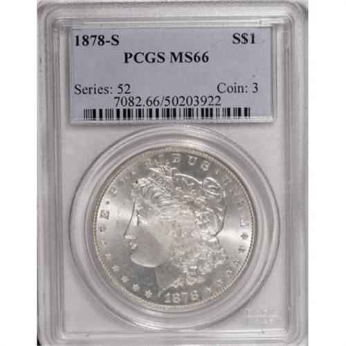 <B>1878-S $1 MS66 PCGS.</B></I> The 1878-S is a popular and, through MS65, plentiful early San Francisco Mint dollar. It becomes somewhat more difficult in Premium Gem, the grade of the present piece, and anything finer is a condition rarity. Strongly lustrous surfaces are silver-white beneath a touch of gold-gray haze. Boldly struck and attractive.<BR><BR><B>Coin Engraver:</B> George T. Morgan<BR><BR><b>Shipping:</b> Coins & Currency (<a target="_blank" href="http://www.heritageauctions.com/common/shipping.php">view shipping information</a>)