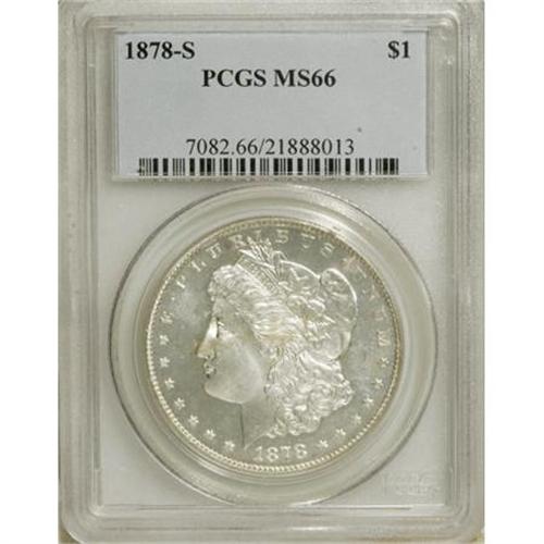 <B>1878-S $1 MS66 PCGS.</B></I> PCGS Population (483/20). NGC Census: (429/29). Mintage: 9,774,000. Numismedia Wsl. Price for NGC/PCGS coin in MS66: $635. (#7082)<BR><BR><B>Coin Engraver:</B> George T. Morgan<BR><BR><b>Shipping:</b> Coins & Currency (<a target="_blank" href="http://www.heritageauctions.com/common/shipping.php">view shipping information</a>)
